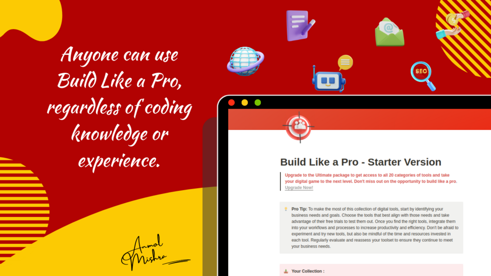 Build Like a Pro is a collection of free tools in various categories that can be used to build MVP and online projects. With two variants to choose from, starter and ultimate, you'll have access to everything you need to take your MVP and Online Project to the next level.