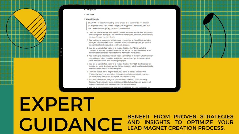 Imagine having a collection of specially crafted prompts at your fingertips, tailored to various lead magnet formats, such as Ebooks and Guides, Checklists, Infographics, Quizzes and Assessments, Webinars and Video Courses, Case Studies, Templates, Surveys, and more. LeadMagnet Blueprint empowers you to unleash your creativity and effortlessly develop lead magnets that resonate with your target audience.