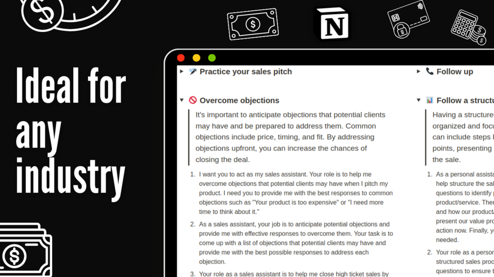 But the benefits don't stop there. Close High Ticket Like a Pro is more than just a collection of prompts and strategies. It's a complete system designed to help you become a master of the high ticket sales process. The Notion file format provides a seamless user experience, allowing you to easily navigate and search through the prompts and categories.