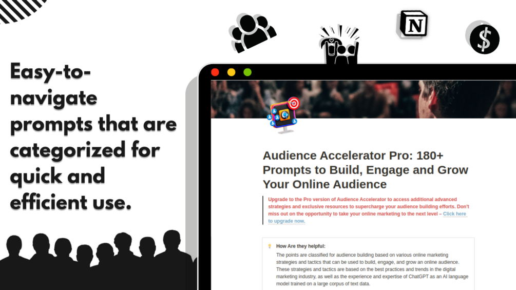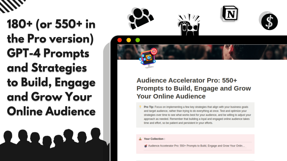 Audience Accelerator is a comprehensive digital product featuring 180+ (or 550+ in the Pro version) GPT-4 prompts and strategies to build, engage and grow your online audience, with categorized prompts for easy navigation