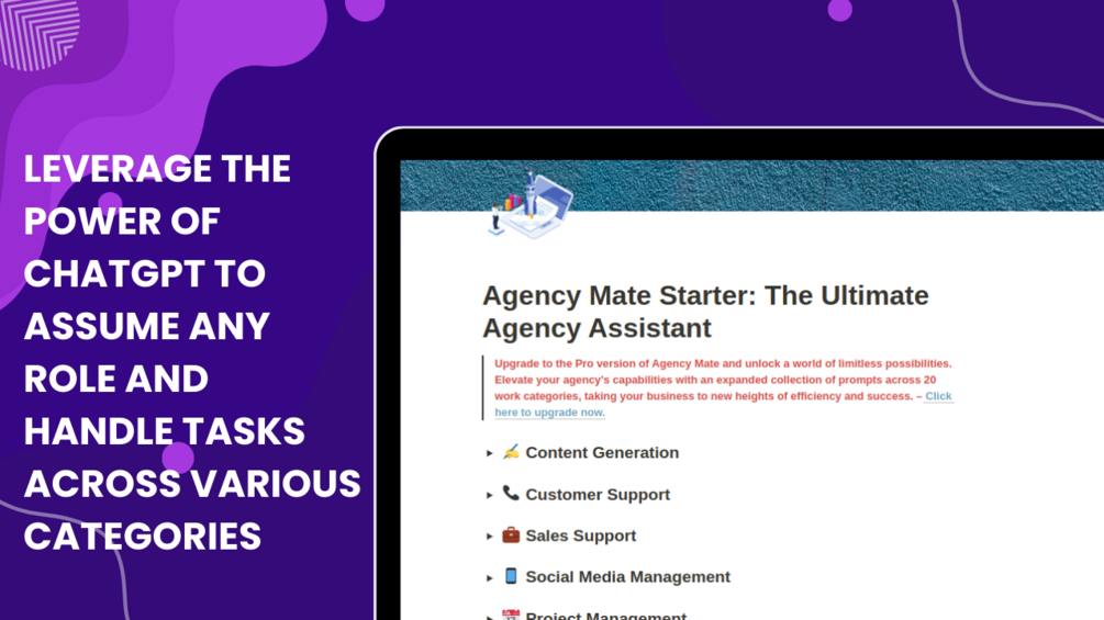 Take action now and get your hands on Agency Mate Pro! This digital product is conveniently organized in a Notion file, making it a breeze to navigate and find the perfect prompt for any job role. Say goodbye to overwhelm and hello to the ultimate agency assistant.